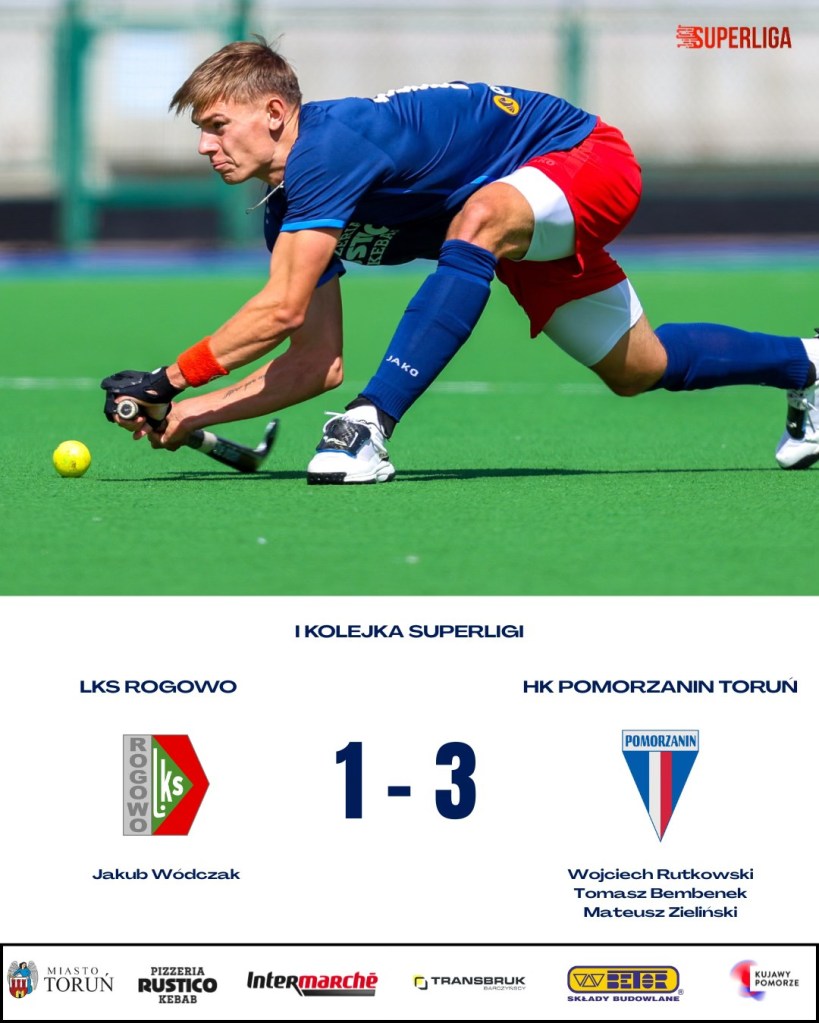 W 1. kolejce Hokej Superliga HK Pomorzanin Toruń wygrał na wyjeździe z LKS Rogowo 3:1. Bramki dla naszej drużyny zdobyli: Wojciech Rutkowski, Tomasz Bembenek i Mateusz Zieliński. Za tydzień zagramy na wyjeździe z WKS Grunwald Poznań.